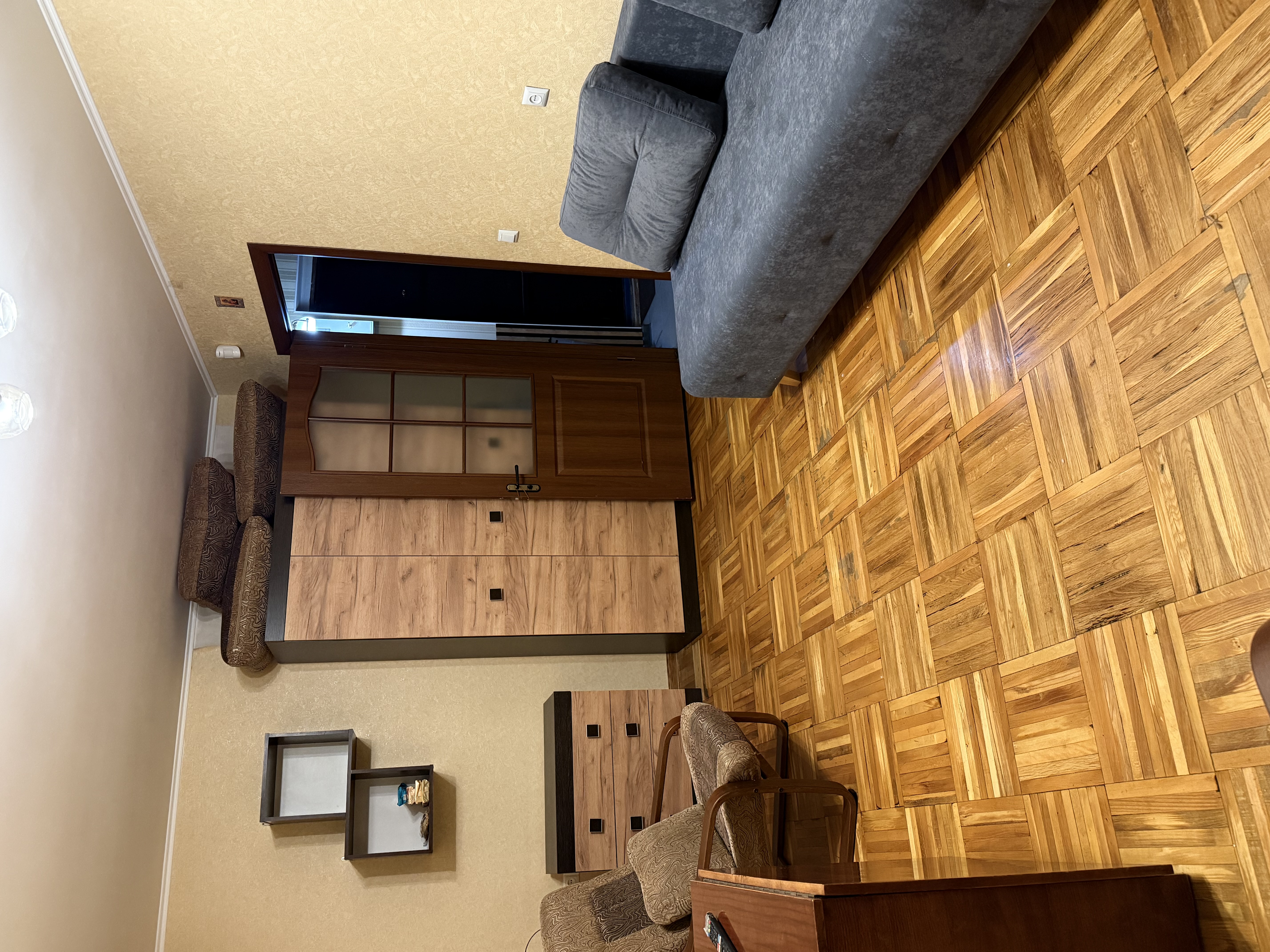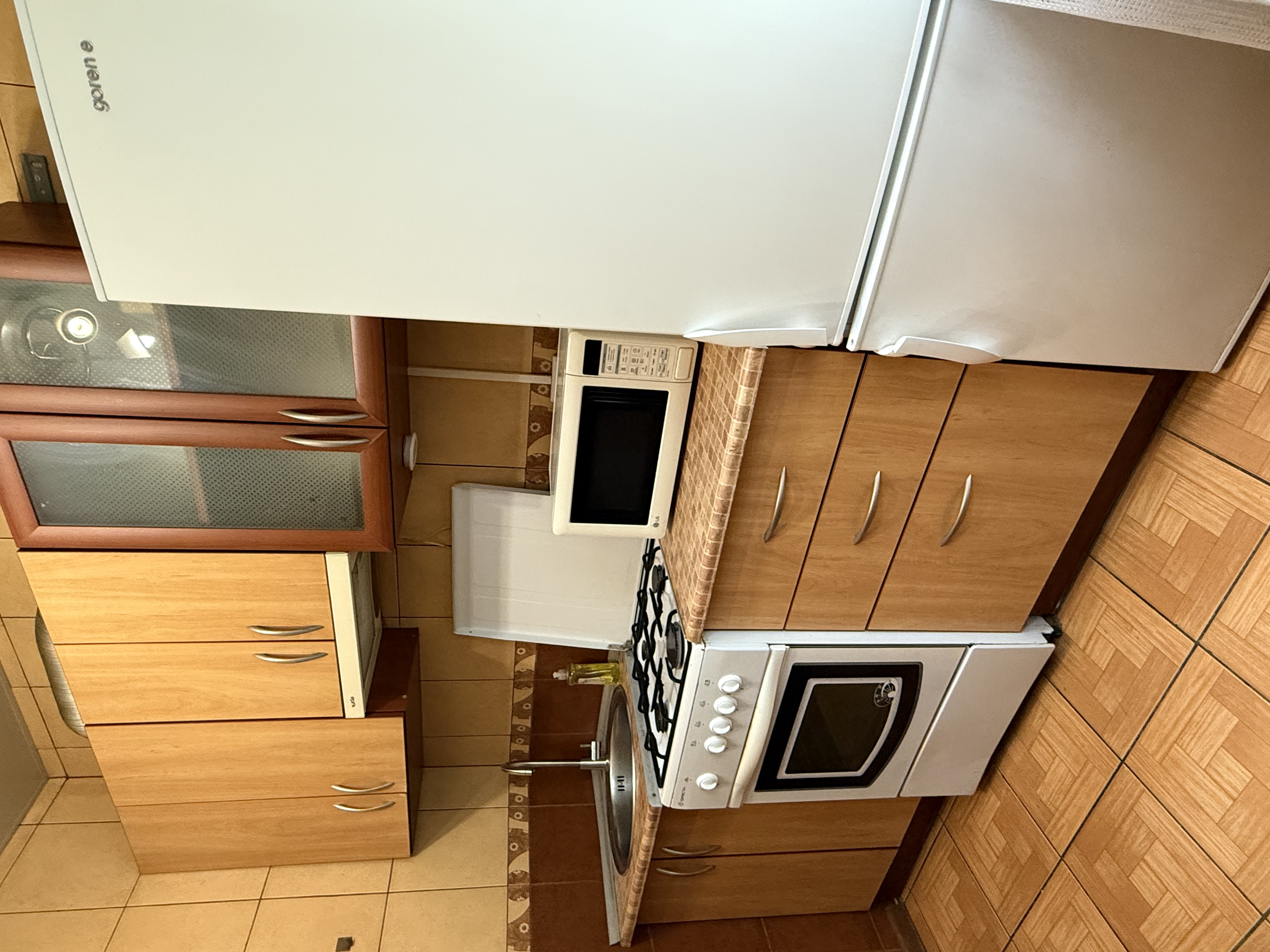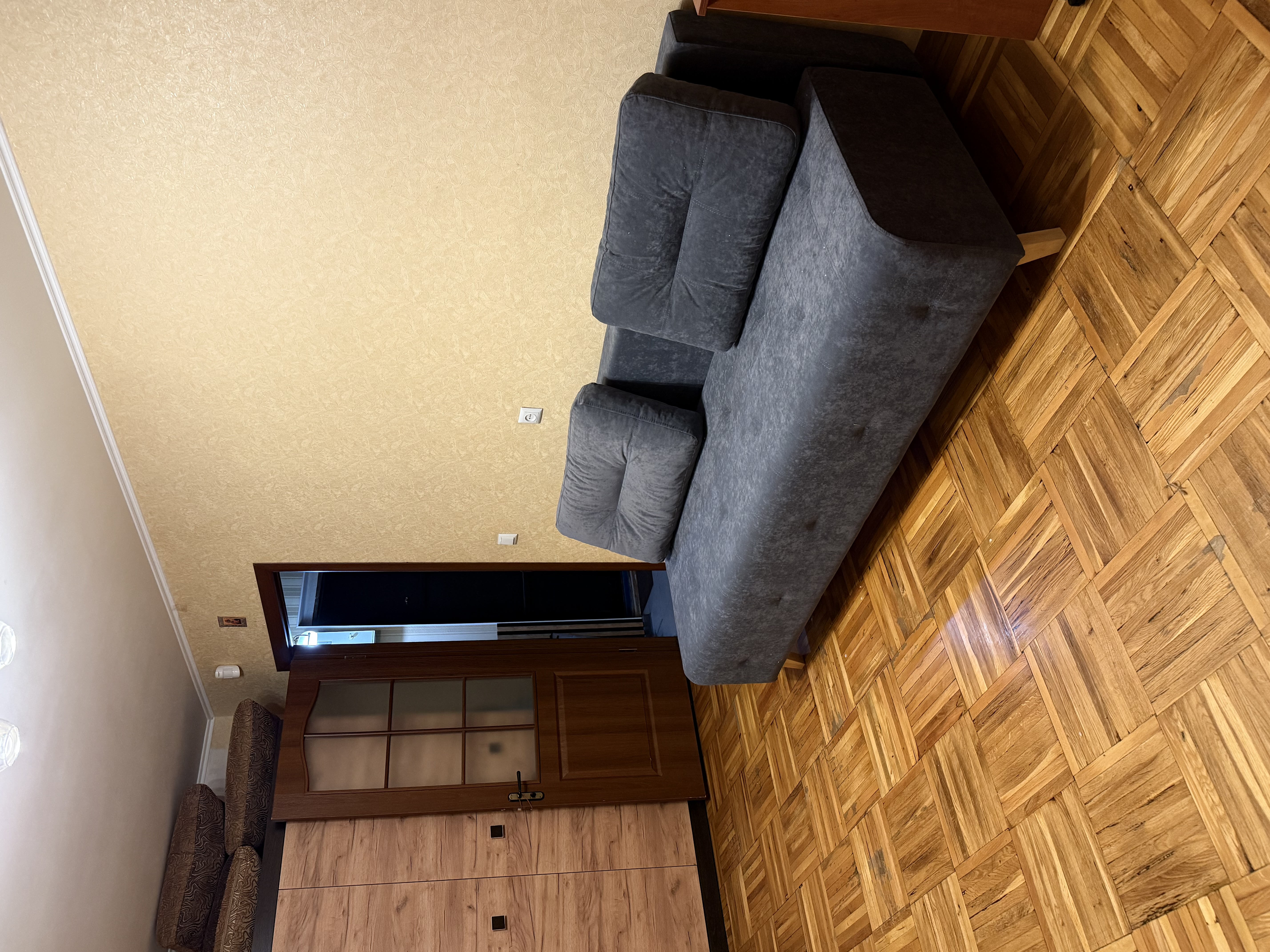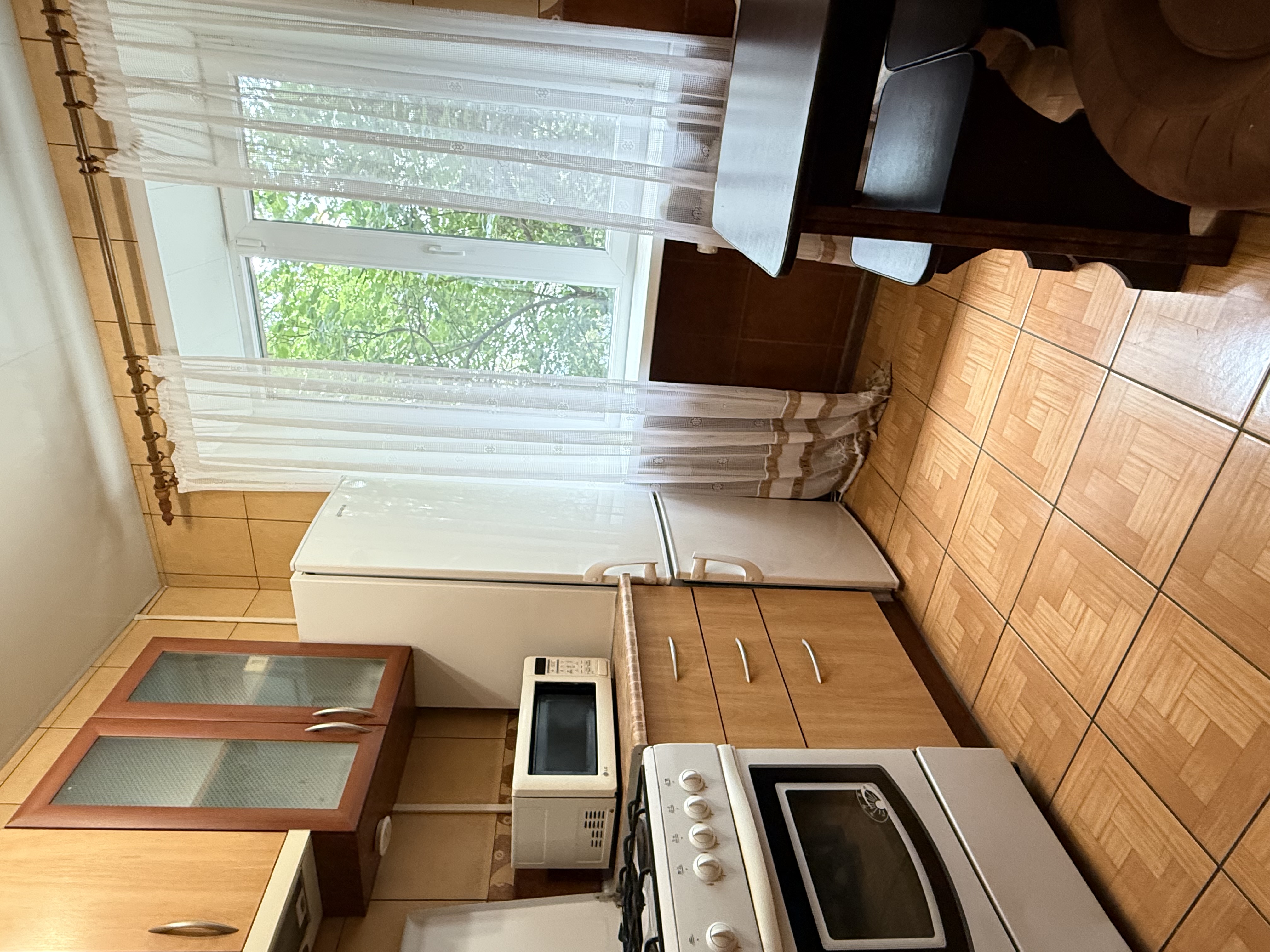 У кухні підлога та коридорі – плитка, підлога в кімнаті – паркет.