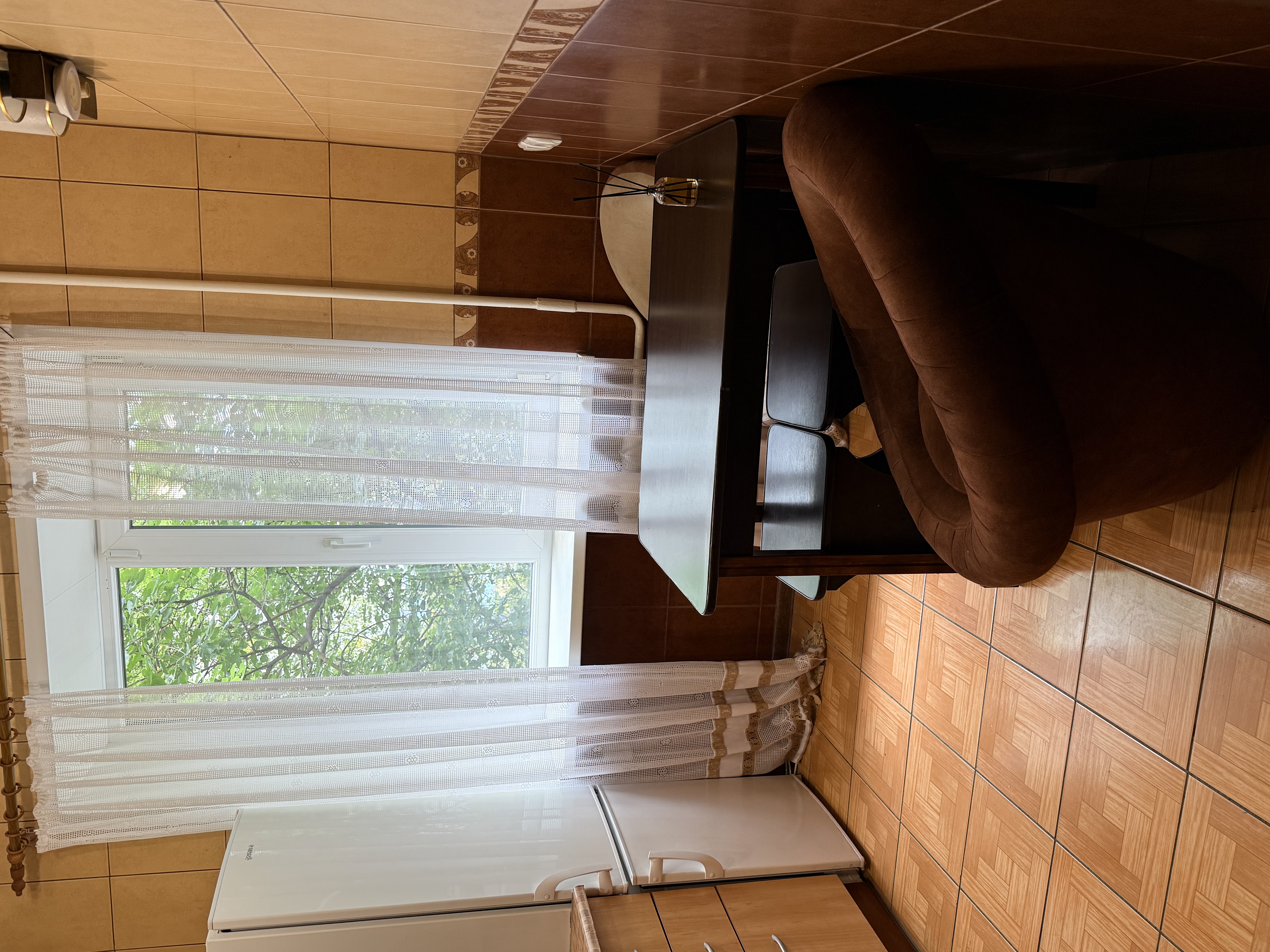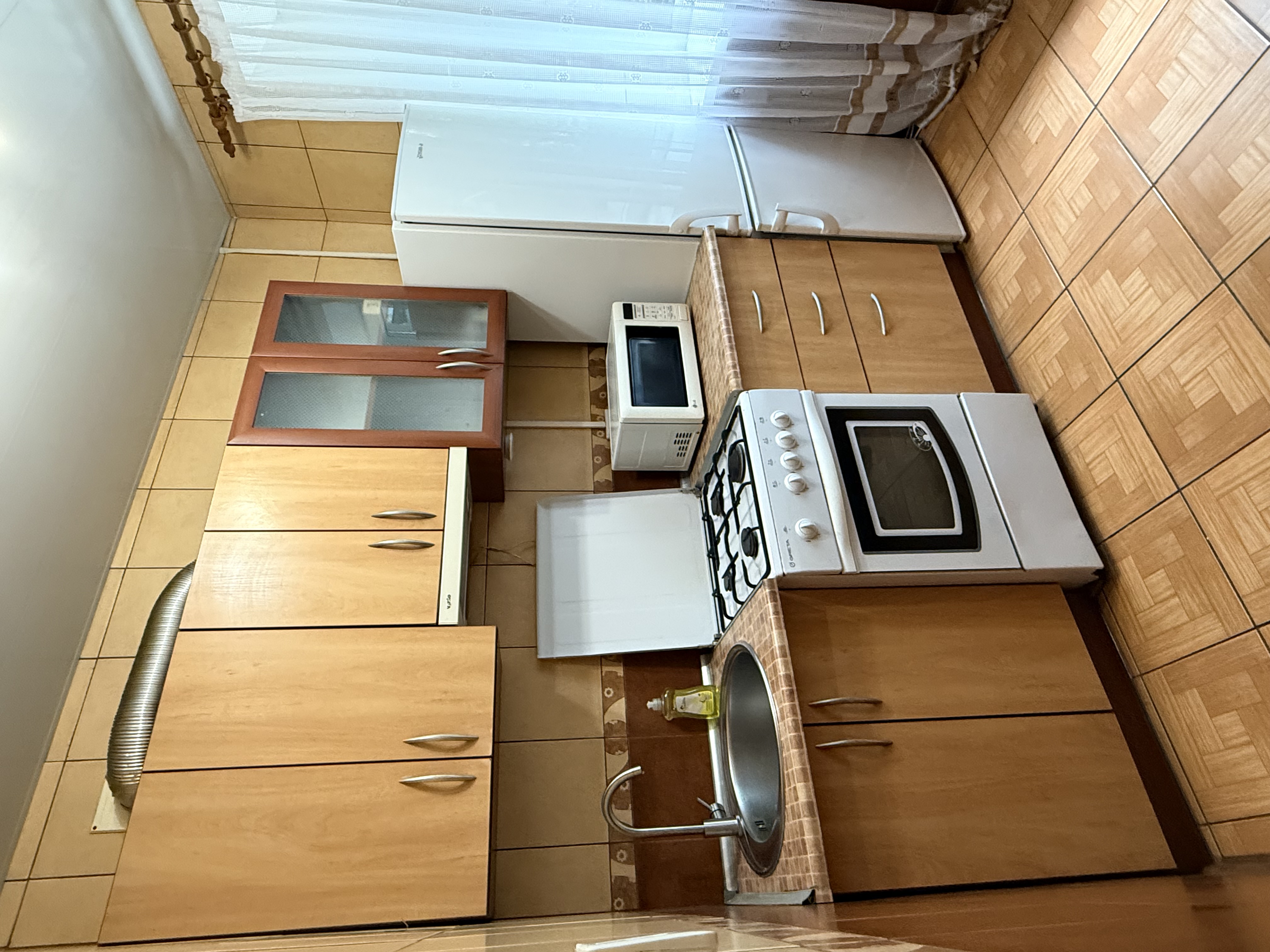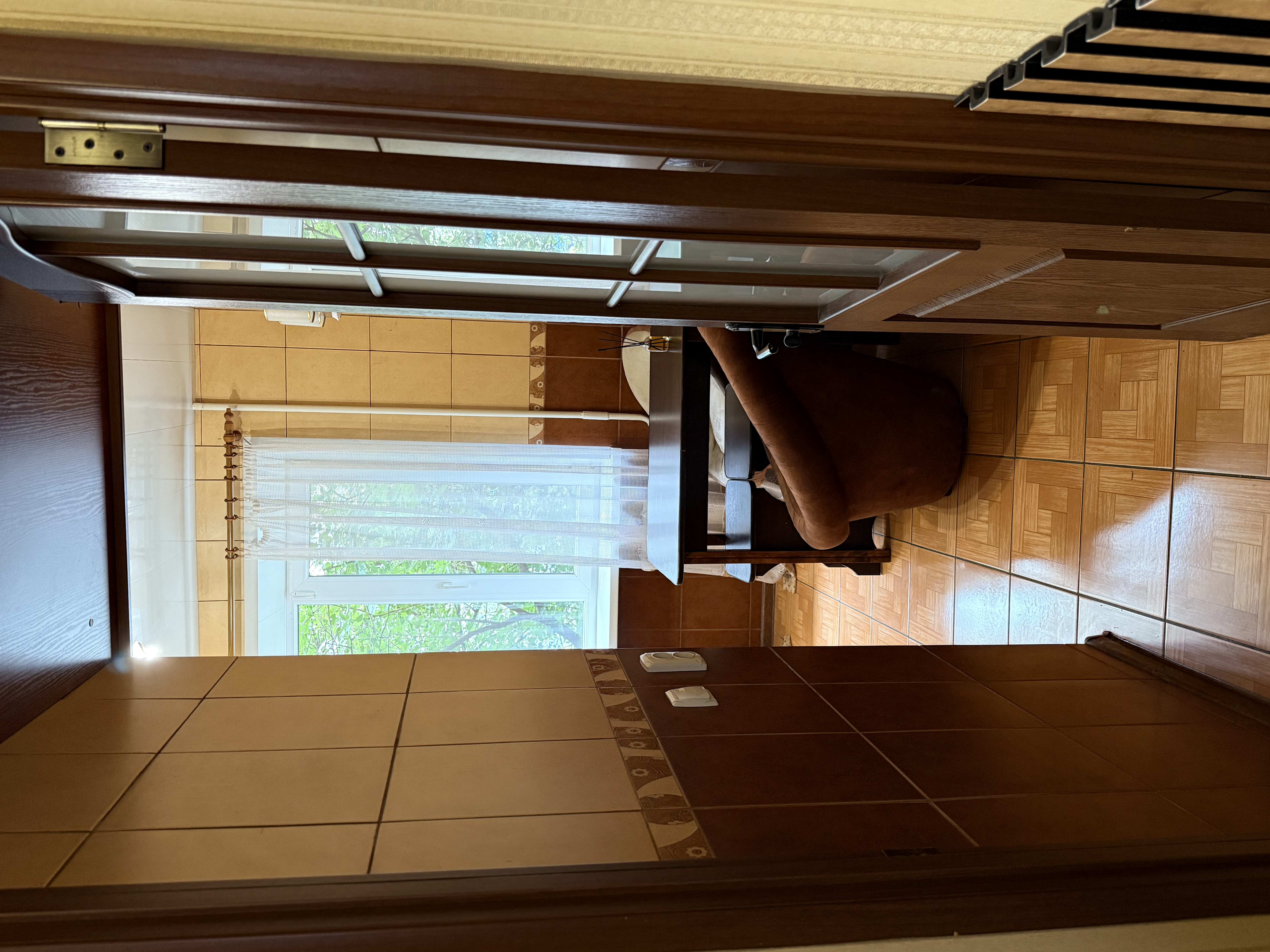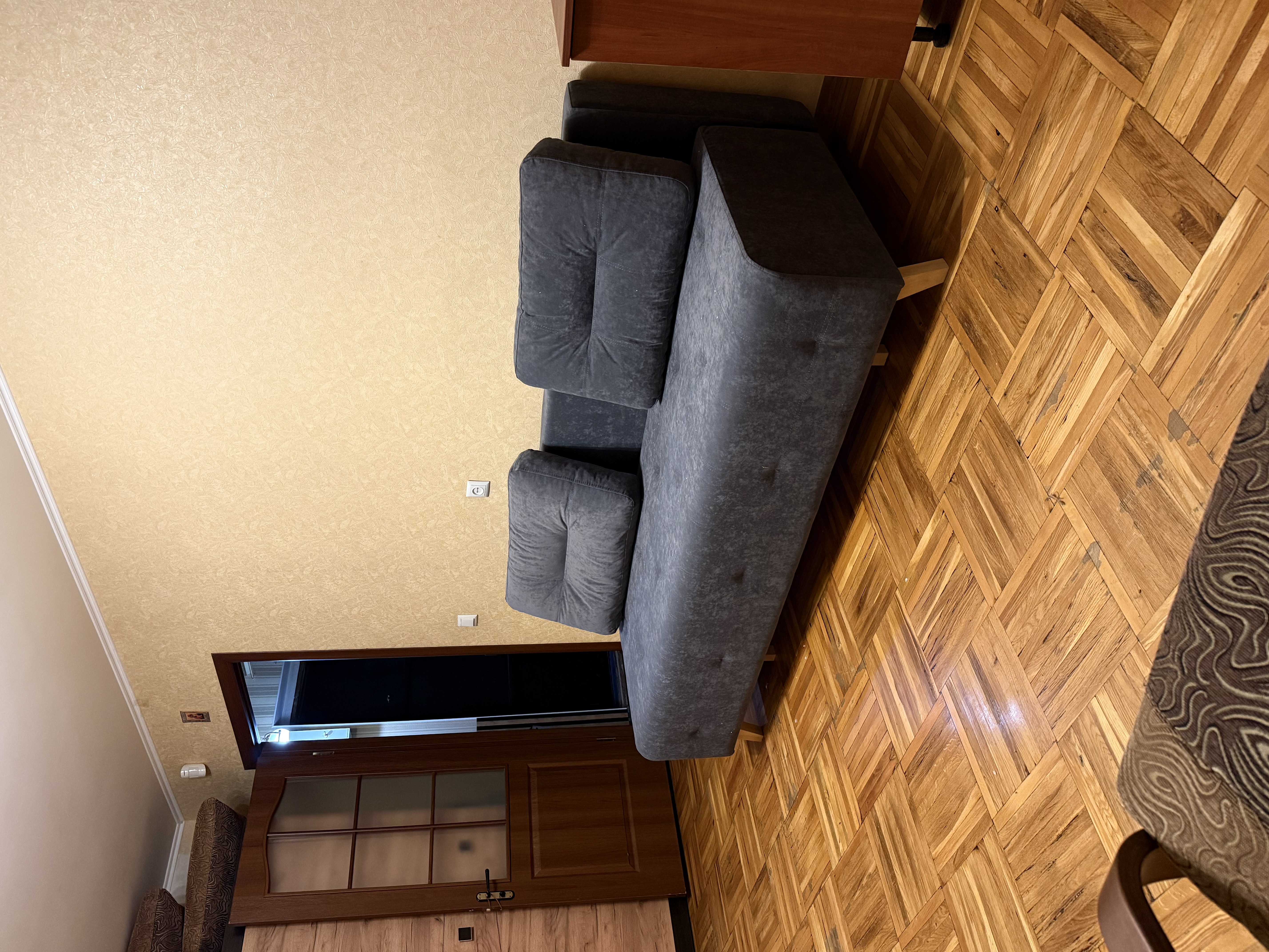 У кухні підлога та коридорі – плитка, підлога в кімнаті – паркет.