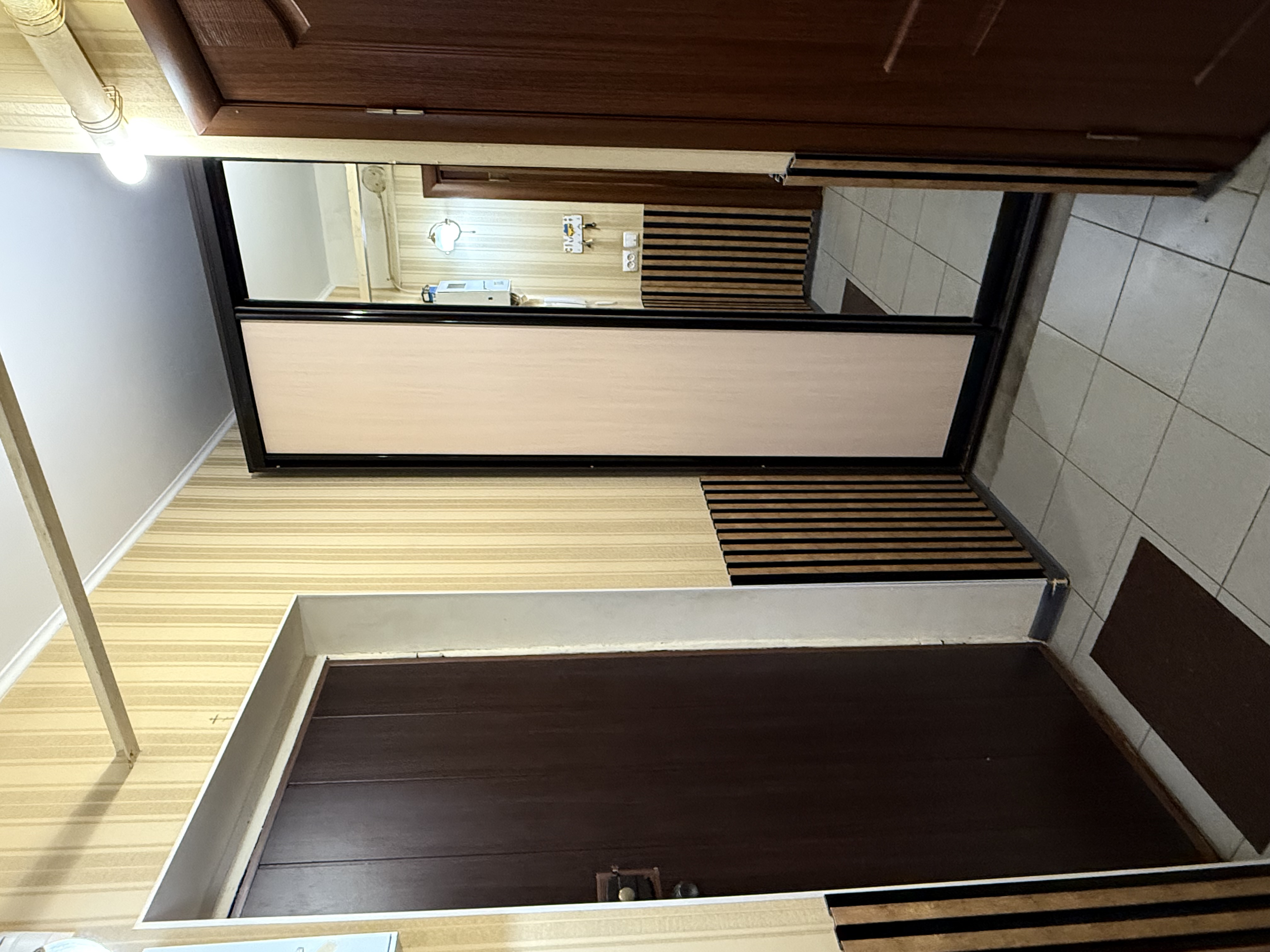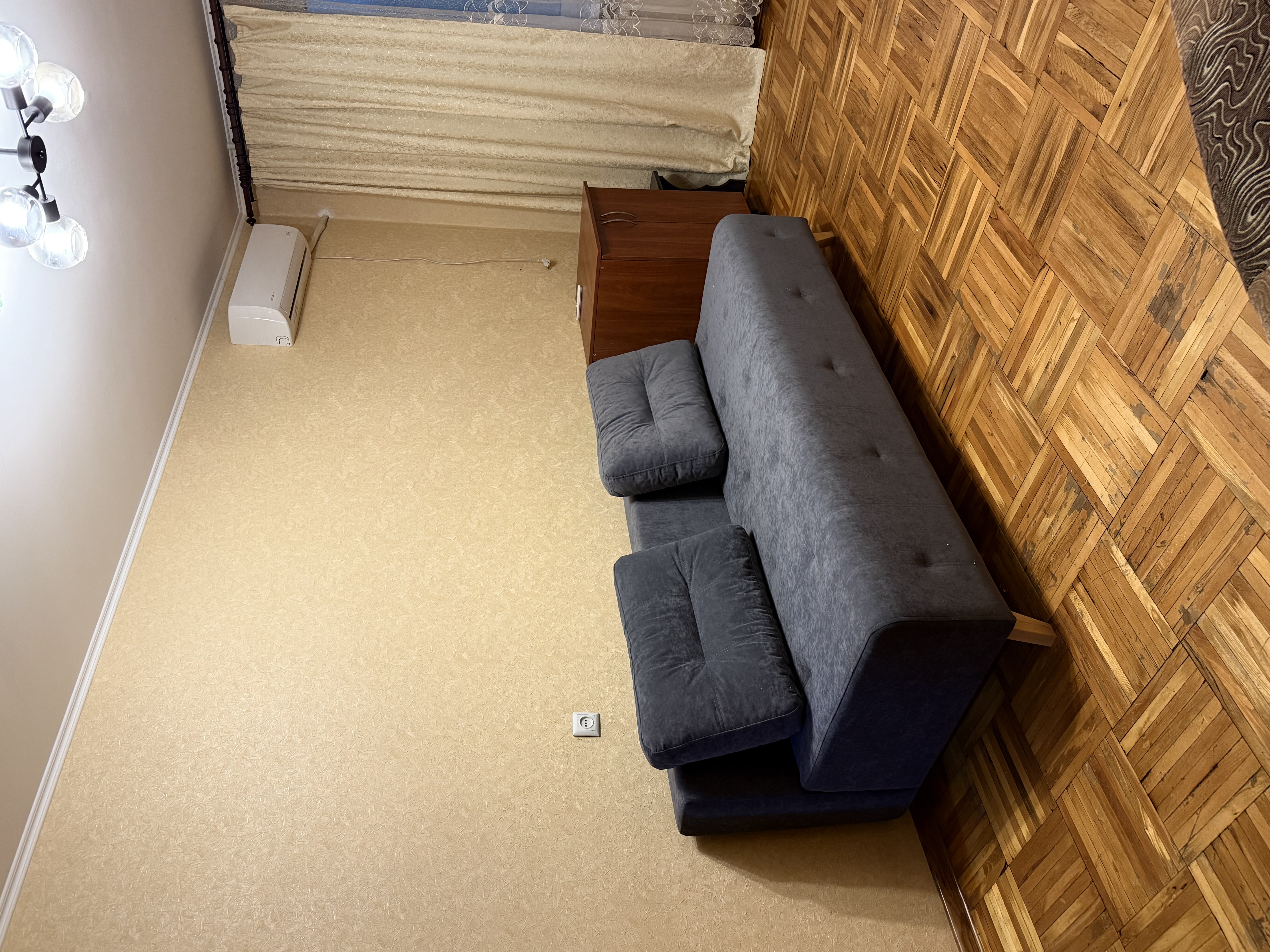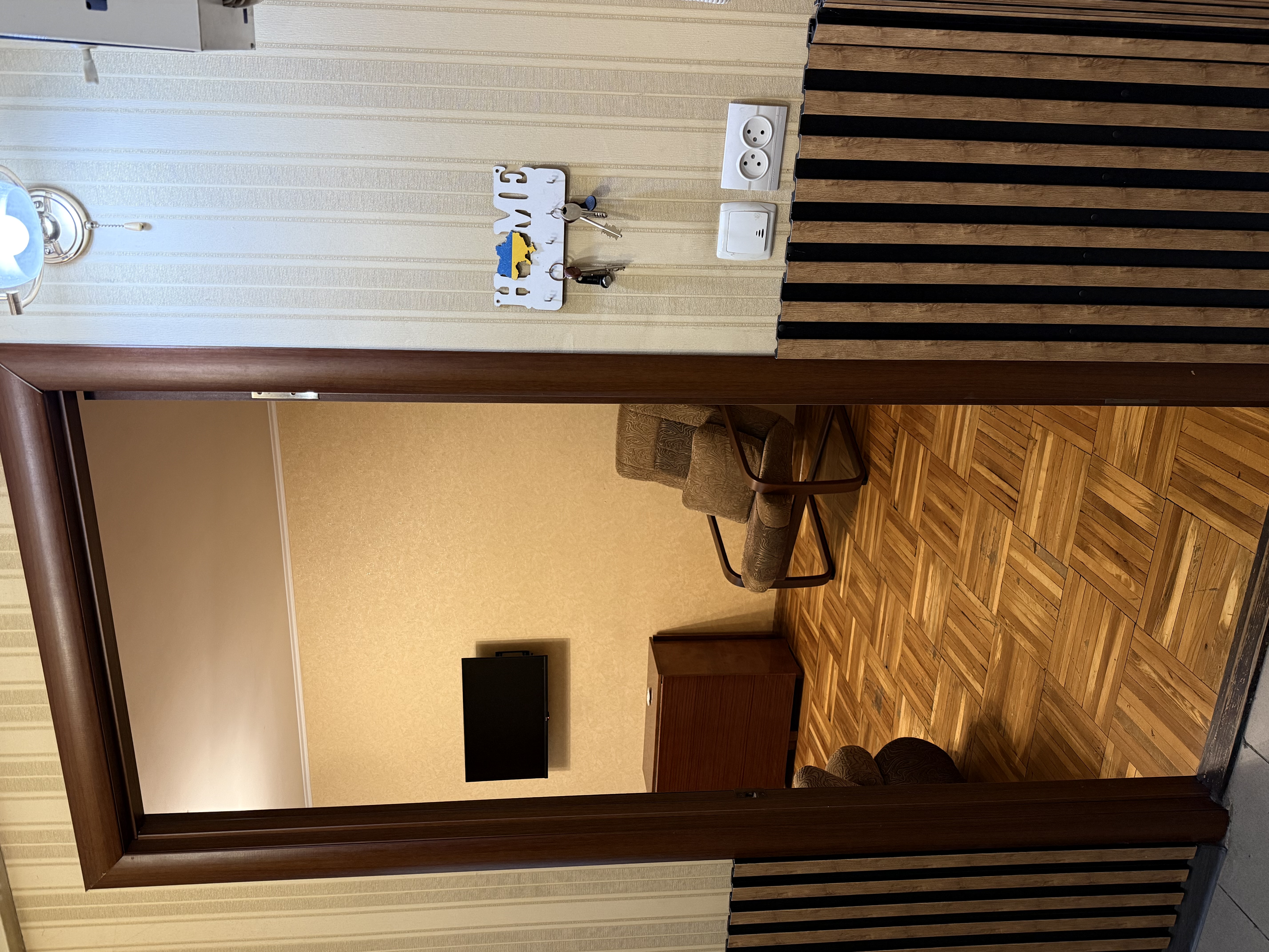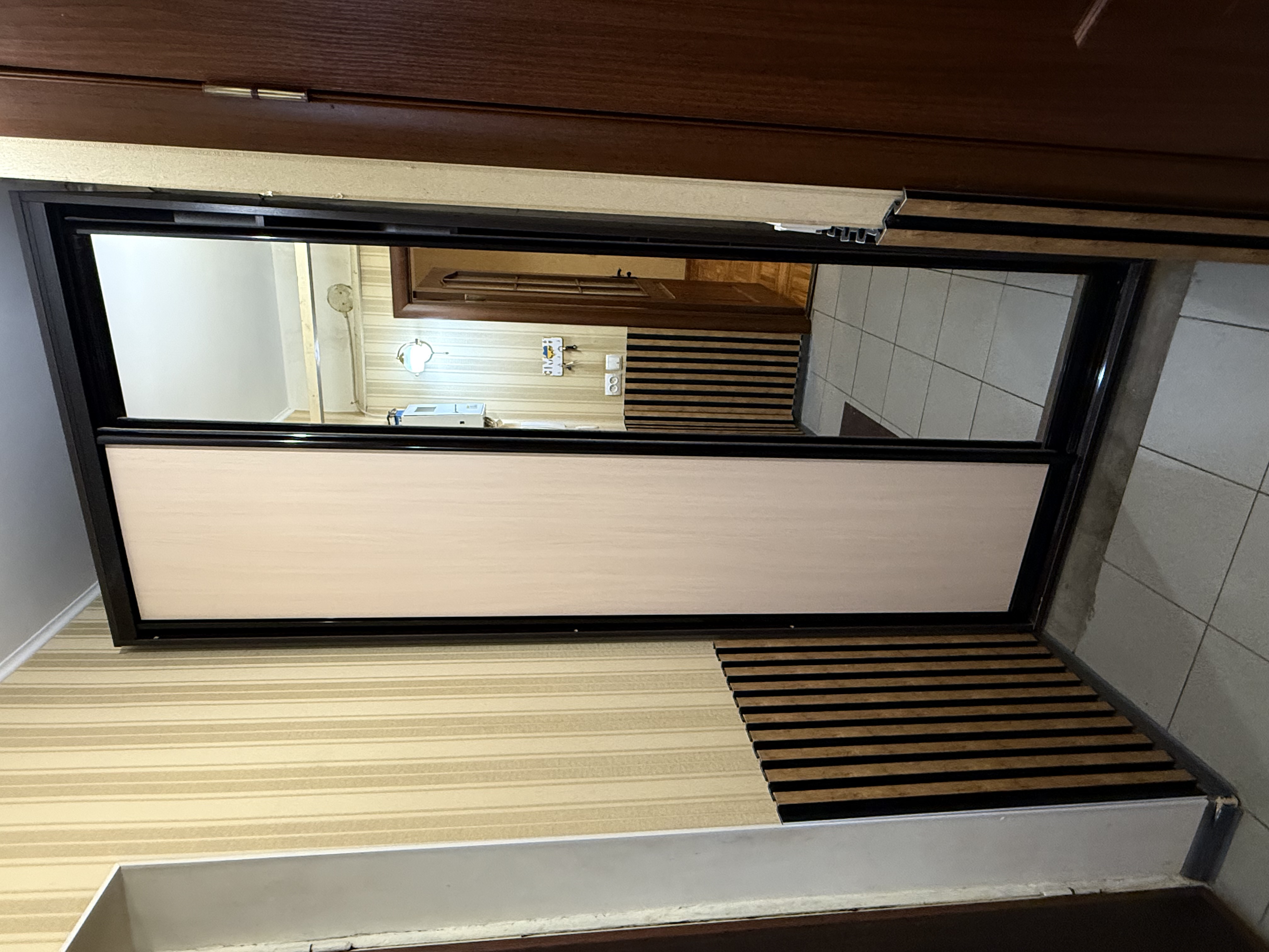 У кухні підлога та коридорі – плитка, підлога в кімнаті – паркет.